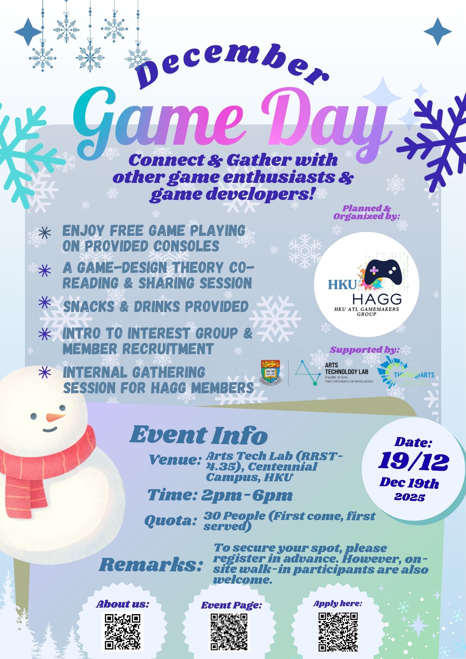 Get ready for an exciting afternoon of gaming and creativity! Arts Technology Lab and Faculty of Arts is hosting its Winter Game Day on December 19th (Friday), and we’d love you to be part of it. Whether you’re into casual gaming, game design, or creation, there’s something here for you!