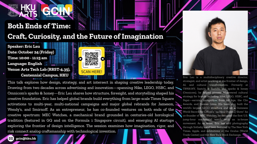 This talk explores how design, strategy, and art intersect in shaping creative leadership today. Drawing from two decades across advertising and innovation—spanning Nike, LEGO, HSBC, and Omnicom’s sparks & honey—Eric Lau shares how structure, foresight, and storytelling shaped his creative foundation. Eric has helped global brands build everything from large-scale Times Square activationsto multi-year, multi-national campaigns and major global rebrands for Jameson, Wendy’s, and Smirnoff. As an entrepreneur, he has co-founded ventures on both ends of the creative spectrum: MEC Watches, a mechanical brand grounded in centuries-old horological tradition (featured in GQ and on the Formula1 Singapore circuit), and emerging AI startups exploring the frontier of design intelligence. The session examines how imagination, rigor, and risk connect analog craftsmanship with technological invention.